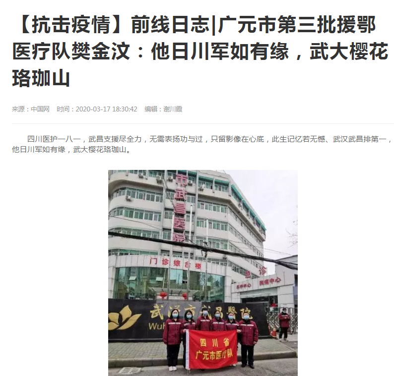 中国网:【抗击疫情】前线日志|广元市第三批援鄂医疗队樊金汶:他日川军如有缘,武大樱花珞珈山