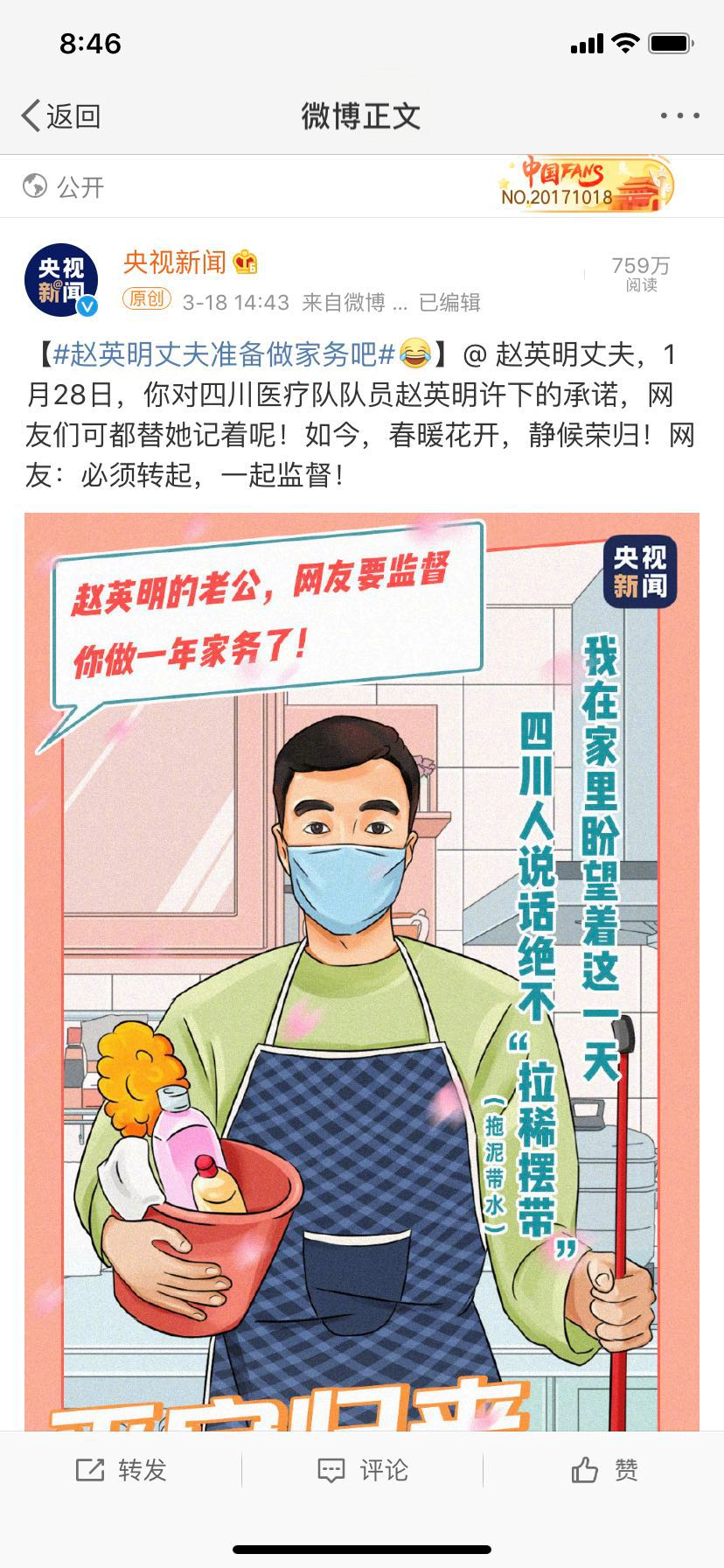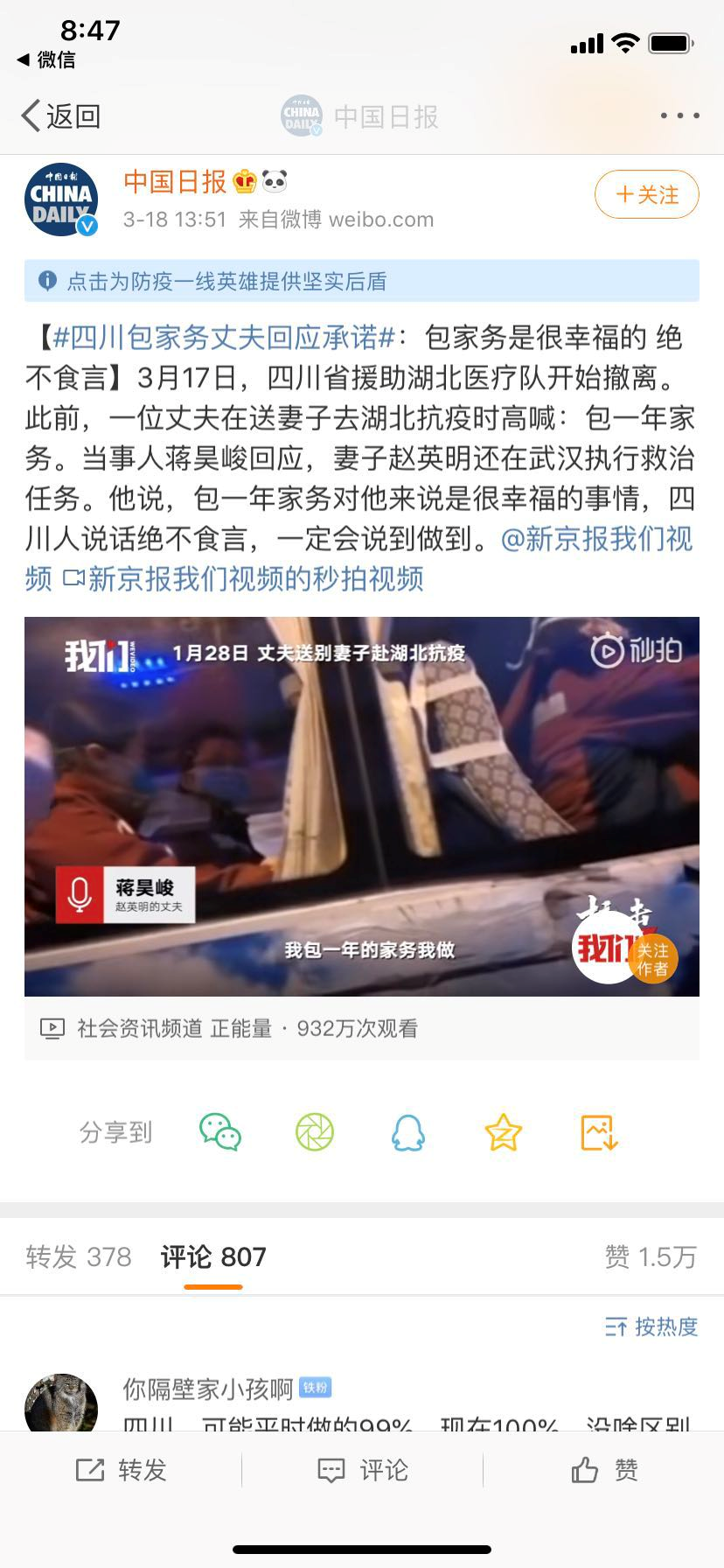 人民日报微博: 妻子还在战疫一线,#承诺包一年家务的丈夫说绝不食言#