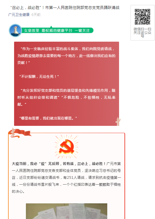 广元卫生健康:“召必上,战必胜!”市第一人民医院住院部党总支党员踊跃请战