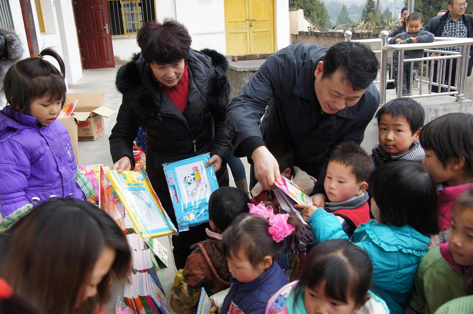 图四,党委书记吴春瑛、院长刘峰向珠江村幼儿园的小朋友发放捐赠的图书及玩具。