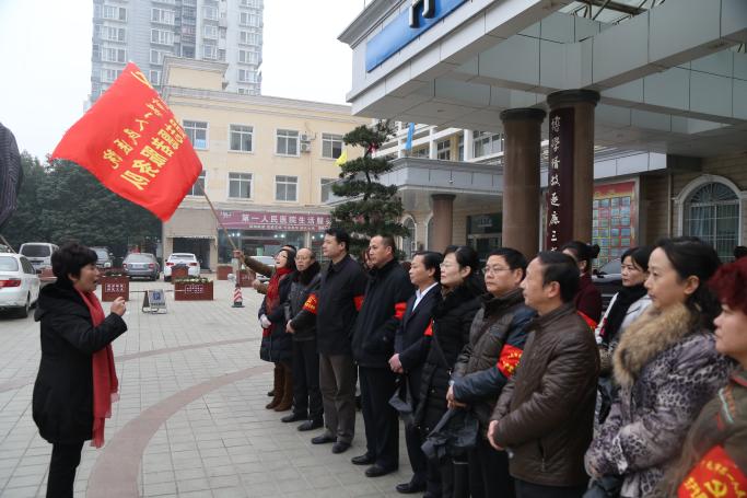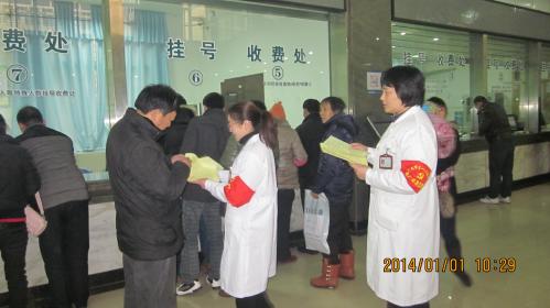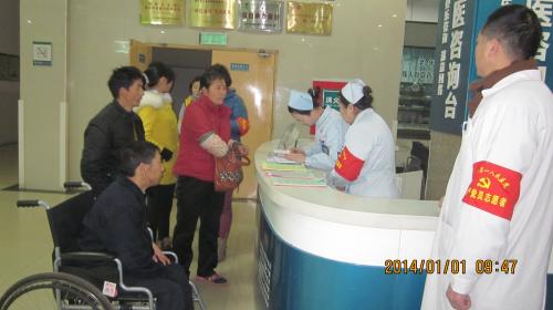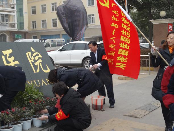 2014年1月1日上午,市第一人民医院党委认真贯彻市委组织部、市卫生局直属机关党委关于开展元旦“党员干部义工日”活动的通知要求,积极组织未值班的党员、干部100余人,由党委书记吴春瑛和党委副书记、院长刘峰及其它副院级领导分三个队带领党员、干部到新老院区、门诊住院部周边、上西坝皇泽社区开展清洁环境卫生、优质导医及下基层爱心义诊志愿服务。
