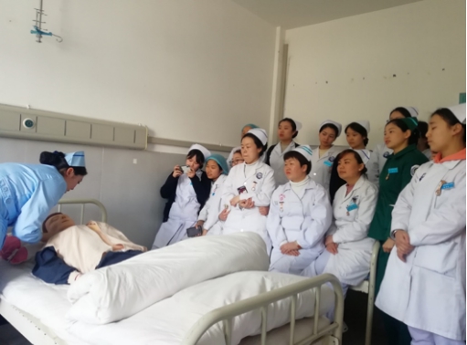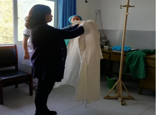 在两位主任授课的同时,曾玲护士长、传琪副护士长和科室骨干共同为基层护理同仁们进行操作示范。曾玲护士长是一位在我院感染科工作30年的资深护理专家,对感染科护理管理有丰富的经验,她就隔离衣穿脱技术和医院感染的防控措施进行了详细的讲解。