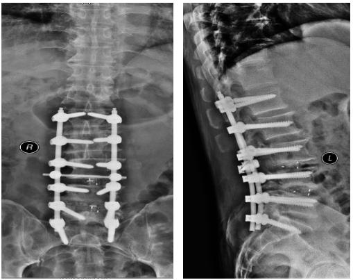 天时地利人和,一切准备就绪,2019年1月7日,骨一科对王师傅成功实施了“经后路腰椎侧弯畸形矫形+钉棒螺钉内固定+腰3/4、4/5椎管切开减压+腰4/5 、骶1双侧神经根探查松解+椎间盘切除+椎间、椎体后侧植骨融合术”,手术历时5小时45分。术后患者恢复良好,腰部侧弯、腰痛等问题一去不复返。