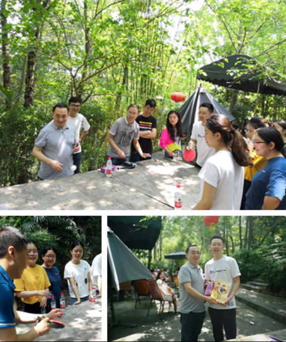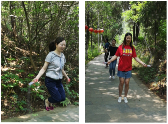 片刻休息后,令人兴奋的跳绳比赛开始了。1分钟内个数最多者获胜,经过三轮的紧张角逐,实习同学胡秋月夺得冠军。紧接着,趣味乒乓球比赛也拉开了序幕。将一个盒子置于球桌一方,参赛者从球桌另一方用球拍将乒乓球打入盒内,总共5球,进球多者取胜。一番激烈比拼后,由放射科冯浩3球险胜。为了活跃现场氛围,活动中还抽取了3个幸运奖。欢声笑语在树林间跳跃着,青春风采在小道上飞扬着。斑驳树影,丽日阳光,一张张微笑的面孔、一声声兴奋的呐喊在山间交汇成一幅轻松和谐、自由欢畅的图画,定格在六月的晴天,也定格在每个人的心中。