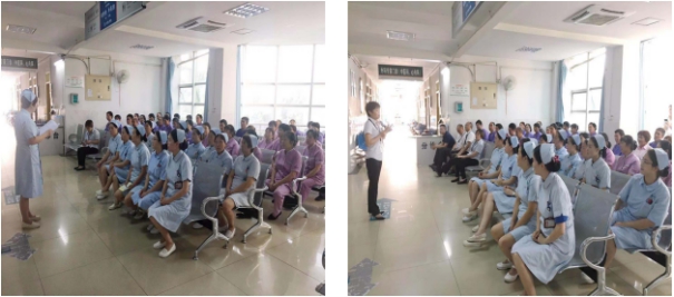7月30日下午17:30,门诊部护士长刘丽组织门诊导诊、分诊护士及门诊后勤保障的员工们利用下班时间,在门诊三楼大厅开展引导胸痛病人就诊的现场培训会。