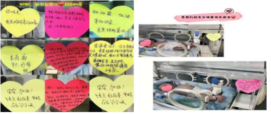 新生儿住院,父母与宝宝就要面对分离,很多时候家长都会焦虑、担心、自责。为了缓解宝爸宝妈的心理压力,增加住院新生儿家属的心理支持,科室提供心愿贴,让宝爸宝妈写下想对宝宝说的话,让他们感受到陪伴与力量。