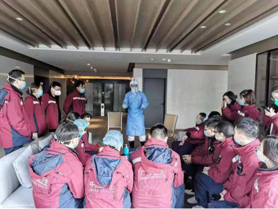 18点30分,医疗队到达酒店,快速用餐后,便与当地的区委政府、武汉红十字医院、酒店对接,了解基本情况以及队员们的需求。