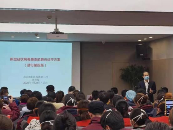 1月29日下午17点30分,北京地坛医院感染科专家蒋荣猛老师,为明天即将进入病区工作的队友们进行院感防护培训,解读最新版新型冠状病毒肺炎诊疗方案,确保每一位深入一线奋战医护人员按照规范做好自我防护,保障自身的生命健康安全。