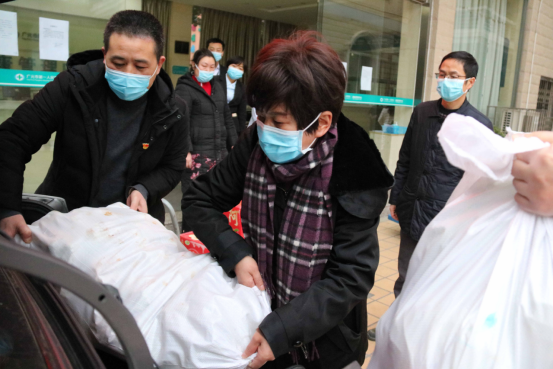 同时,院工会摸排走访,及时将了解到的情况反映给院领导。对于小孩老人照顾困难的院内双职工家属,医院酌情调整排班情况;社会各界的捐赠水果、蔬菜等慰问物资首先送给医疗队员家属;考虑前线队员不习惯武汉的饮食,工会随即前往超市采购大批生活物资通过邮政寄往武汉……