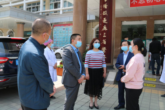 2020年4月30日,市卫健委副主任邓功会、市残联领导一行人来院慰问援鄂医务人员,督导检查疫情防控工作,院纪委书记兼工会主席晏荣,党委委员、副院长何东权以及相关职能部门负责人陪同。