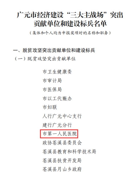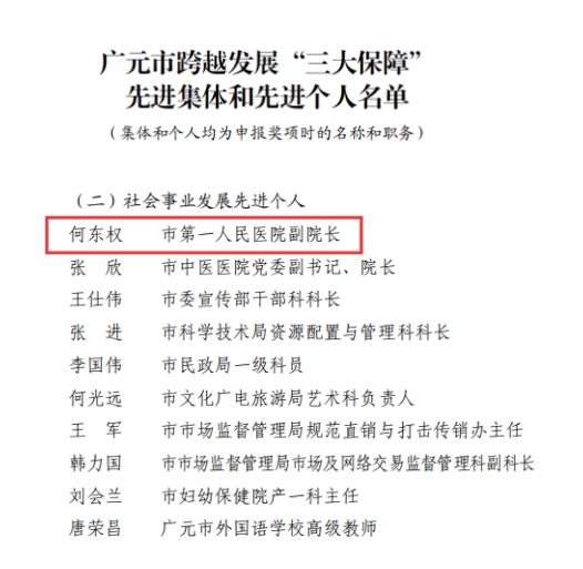 近日,中共广元市委印发了《关于表彰2018年广元市经济建设“三大主战场”突出贡献单位、建设标兵和跨越发展“三大保障”先进集体、先进个人的决定》,对2018年全市各级各部门坚持以习近平新时代中国特色社会主义思想为指导,深入学习贯彻党的十九大和习近平总书记对四川工作系列重要指示精神,认真落实省委、省政府各项决策部署,在全面推动高质量发展,坚定实施“三个一、三个三”兴广战略等重大工作任务中涌现出来的先进单位和个人进行了表扬。其中,市第一人民医院荣获“广元市2018年度脱贫攻坚突出贡献奖”,院党委委员、副院长何东权同志荣获“广元市跨越发展‘三大保障’先进个人”。