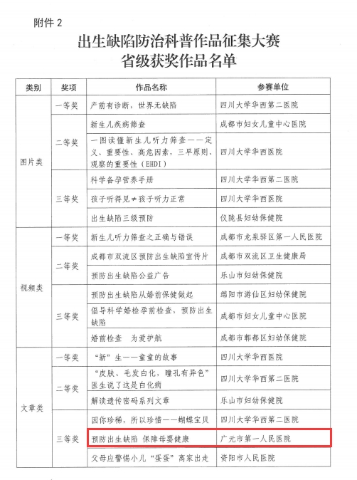 为贯彻落实《健康中国行动(2019-2020)》,加强出生缺陷防治宣传教育和科普资源建设,提高公众优生意识和健康素养水平,国家卫生健康委于2020年8-9月举办了出生缺陷防治科普作品征集大赛。接到大赛通知后,医院高度重视,对参赛工作进行了精心部署。在医务科的组织下,产科积极创作,参与申报。作品针对出生缺陷的定义、出生缺陷的三级预防措施、产前筛查等九个方面的内容进行了详细的科普介绍,主题突出、图文并茂、通俗易懂,兼具科普性和实用性。经过一系列严格评审,最终该作品从全省68件作品中脱颖而出,获得了出生缺陷防治科普作品征集大赛省级(文章类)三等奖,是我市唯一获奖的作品。