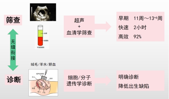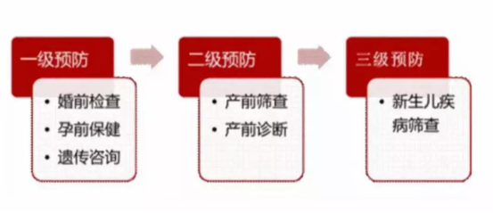二级预防:是在孕期采取的产前筛查和产前诊断,目的是减少致死、严重致残缺陷儿的出生。内容包括:孕期母血产前筛查、高风险人群绒毛、羊水、脐血染色体检测、彩超等。