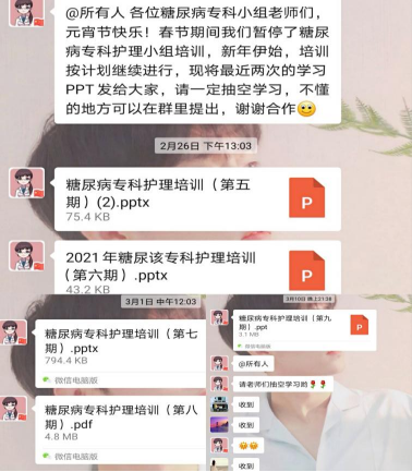 课后,护理老师将学习培训课件与焦点讨论问题分享至医院“糖尿病专科护理小组”微信群,供全院各科糖尿病联络护士参考学习,实现全院同质化护理管理。
