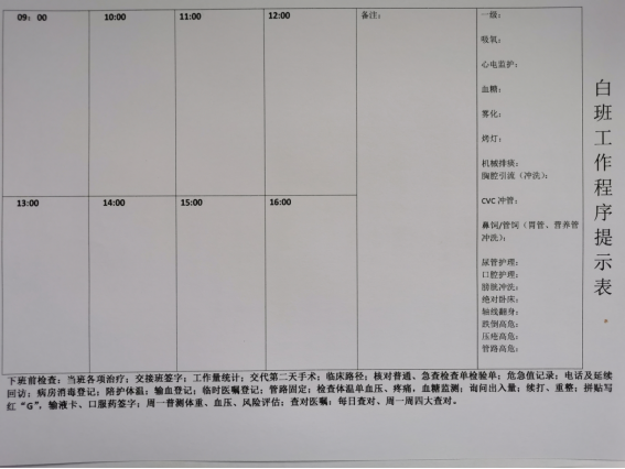 俗话说好记性不如烂笔头,事情一多,再好的脑子也记不清、记不全。为了解决临时记录的问题,护士姐妹们之前也想过不少办法。左思右想,最后护士长想了个好办法,精心制作各班工作表格,给每人每班配一个专门的夹板。这个工作表格分别为白班、上夜及下夜,包含了各个时间段的内容,又有日常工作提醒,还有贴心的下班前工作检查事项,涵盖了每个班次的主要工作内容。夹板的应用既能方便随时随地记录,又能集中收纳,还可以查看之前的工作情况。现在每个人上班前都整理好自己的夹板,下班交班时也会带上一天的工作重点进行交班。