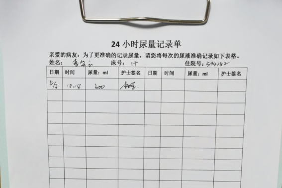 心脏病患者记尿量是为了观察患者的出入平衡,既能反应心功能情况,又能反应肾功能情况。准确的记录尿量能为医生提供调整利尿剂依据,而心脏外科的患者及家属往往记尿量的依从性不高。一方面重视度不够,一方面记录工具不足,有的还用药盒、零食盒,甚至凭记忆估计。为解决这一问题,护理团队也为患者专门制作尿量记录单,并专程购买挂钩和夹板。从此,尿量记录的问题就迎刃而解了。