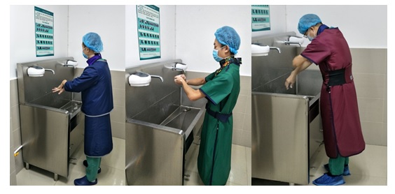 为防辐射,全副武装的李江涛主任戴上铅帽,和助手准备进入手术室,准备术前器械。全身穿上铅衣的医生们在辐射中,为病人实施介入手术,他们今天要为一例食管癌下段鳞癌放化疗后患者实施食管癌支架植入术。患者术前食管造影示:食管完全被压迫闭锁,呈杯口状改变,食管下段未见造影剂显示。狭窄段未见丝毫造影剂显示,可以判断完全闭塞。医生在手术中经导丝顺利引入支架系统,释放支架位置良好,患者口服造影剂顺利,无明显吞咽困难感,造影显示狭窄段食管充盈,造影剂顺利进入胃内,手术顺利。说起来很简单,这一台手术下来显示屏里显示李主任和助手在X光辐射下工作了35分11秒。手术结束后,李主任利用两台手术的间隙,一边给自己的手消毒,一边告诉我们,食管支架可在控制肿瘤病情恶化的同时,让患者顺畅进食、最大程度提升其生活质量,极大的缓解患者吞咽困难等症状,延缓肿瘤病情进一步发展,有效提升患者的生活质量。目前我院所用的食管支架具有优良的生物相容性和耐腐蚀性,且具有记忆特性及超弹性,可大大降低植入术后不良反应及并发症。随着介入技术的发展,食管癌支架植入术广泛应用于临床,为无法手术切除的食管癌患者提供了新的有效的治疗方式。据不完全统计,以每位介入医生平均一个工作日参与5台手术计算,象李主任这样的介入医师每天要在辐射中连续坚守4小时以上,当然这还不包括急诊。