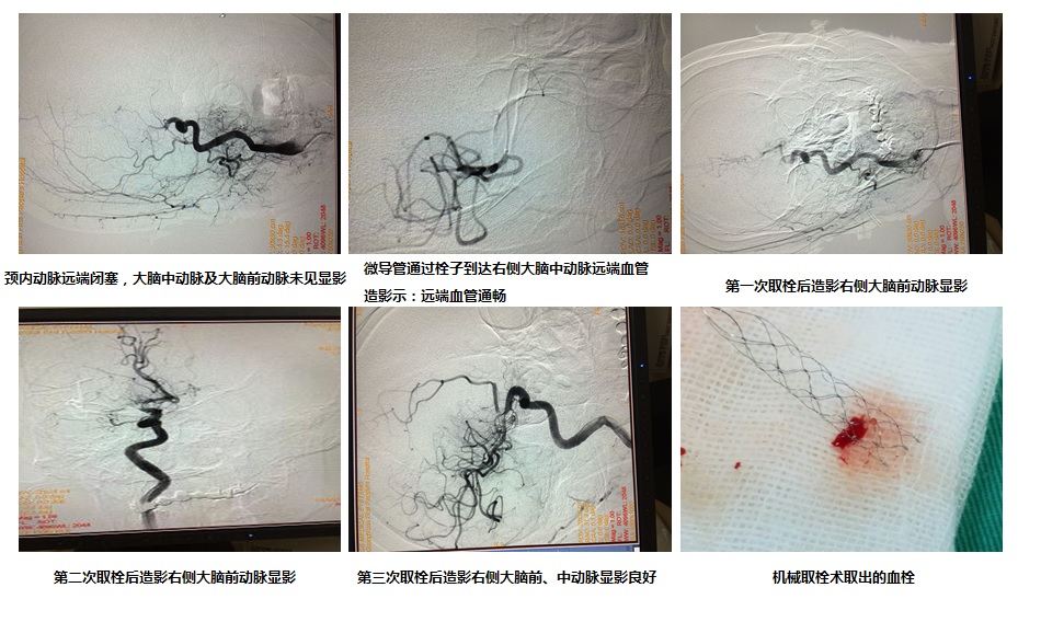 患者急诊收入我院神经内科二病区后,值班医生迅速完善相关检查。“发病时间不到2个小时,积极进行血管再通治疗极为重要”神经内科二病区主任医师戴东璟提出诊疗意见。考虑到患者既往有“房颤”病史,栓子脱落可能性极大,常规静脉溶栓可能效果不佳,“经讨论决定:经动脉开通闭塞血管。”与家属充分沟通及取得家属的同意签字后,患者被迅速送入介入室。手术由我院放射介入中心主任李江涛带领的介入治疗团队在局麻下为患者实施“全脑血管造影术及脑动脉取栓术”。术中造影示:主动脉弓呈“Ⅱ”型。右颈内动脉远端(右侧大脑前中动脉分叉处)未见显影,右侧大脑中动脉及前动脉未见显影。造影后行右颈内动脉远端及右大脑中动脉机械取栓术,历经2个多小时紧张有序的介入手术,顺利将堵塞于患者脑干血管内的血栓取出,恢复血流供应。术后造影显示:闭塞大脑动脉完全开通,患者左侧肢体立时可以活动。患者生命体征平稳,24小时意识恢复,72小时完全清醒,目前已进入康复治疗阶段。