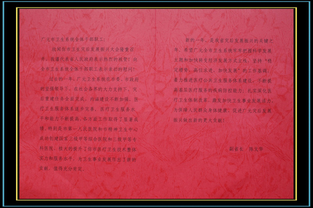 沈骥厅长宣读了陈文华副省长的贺信。陈副省长对广元市卫生灾后发展振兴所取得的成就、对我院成功创建“三级甲等综合医院”表示祝贺。
