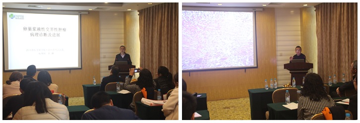 四川大学华西医院病理科张尚福教授以“肺癌小组织的活检与病例分享”进行了专题讲座,他从肺癌小组织活检的诊断原则、注意事项以及诊断中的陷阱结合典型病例做了系统的讲述,对诊断中的要点、陷阱及诊断报告的技巧进行详细讲解;四川省人民医院病理科主任徐刚教授以“卵巢浆液性交界性肿瘤病理诊断及进展”为题,对卵巢浆液性交界性肿瘤WHO分类、诊断原则及鉴别诊作了详细讲解;市第一人民医院病理科主任何兴状副主任医师现场进行了“疑难病例讨论”,他先从2例富于巨细胞的骨肿瘤病例进行讲解,由徐刚老师解答了诊断中的疑惑,然后汇报1例早期肺癌病例结合影像学及组织形态,张尚福老师就术中诊断原则及微浸润腺癌和浸润性腺癌鉴别诊断进行详细阐述。最后徕卡公司高级技术工程师张晓亮和李敏讲述了“徕卡免疫组化和分子病理诊断新方案”和“常规染色新方案”,现场分享了全新技术操作方案。