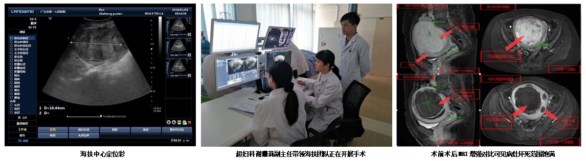 张女士因“经量增多10+年,发现子宫肌瘤15天”于2018年1月1日入院。术前完善相关辅助检查,B超提示“前位子宫,后壁子宫肌瘤,大小约11cm!病灶内部血供丰富”。妇科谢珊莉副主任带领的专家团队向患者及家属详细介绍了海扶治疗的理念,并在传统开腹手术、腹腔镜微创手术、海扶治疗等几个方案中反复斟酌,从治疗效果、患者的身体状况和经济条件等多方面进行综合评估,最终和患者达成一致意见-“海扶治疗是最佳的选择”。