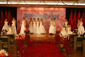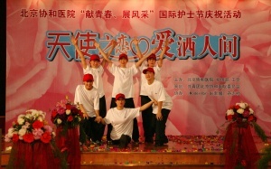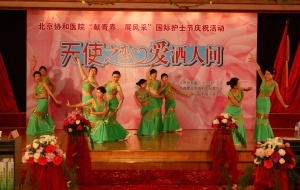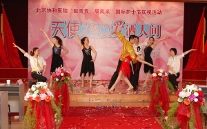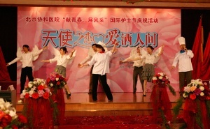 护理部吴欣娟主任带领护理部全体同仁表演手语“感恩的心”,深深感动了所有在场观众;英语情景剧《天职》展示了护士“迎奥运学英语”的学习成果,该剧不久前获得了北京市总工会、北京市卫生局和北京护理学会联合举办的双语服务年英语情景剧表演赛三等奖。由各科推荐的护士组成了一支时装模特队,她们穿上多彩的工装和洁白的婚纱,展示了协和护士高雅的气质和美好的形象,令大家赏心悦目,将活动推向高潮。庆祝活动持续了近2个小时,嘉宾们对协和护士大加赞誉,称赞协和护士不仅技术过硬,服务热情细致,而且多才多艺,是一支活泼上进的优秀队伍。