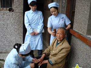 2009年7月26日(星期天),我院普外科护士长和其他三名护士一行,一大清早就买了牛奶、水果等营养品,驱车前往利州区大石镇缠龙村五组,去看望和回访一名3个月前曾在我院手术治疗的83岁孤寡老人樊西英。