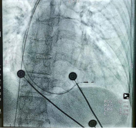 图二:术后X影像,提示心室电极固定在室间隔中部(为左束支区域起搏的理想解剖位点)