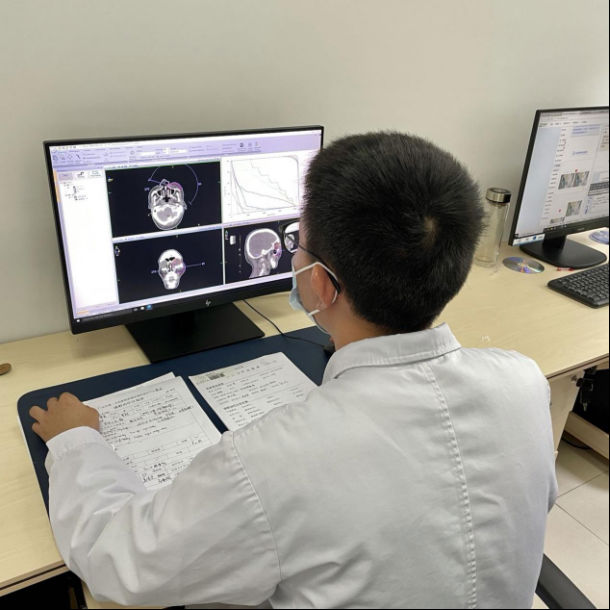 确定治疗方案后,放疗中心的治疗师们紧锣密鼓地开始前期各项准备工作。做膜具、靶区勾画、制定放疗计划、验证和审核……一系列准备后,王大叔怀着忐忑的心情开始接受放射治疗。