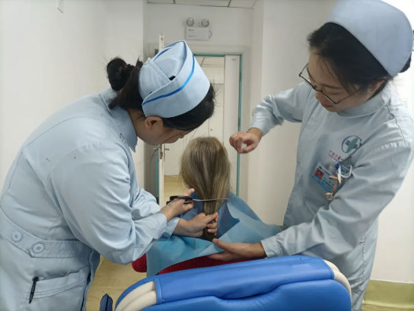 72岁的余奶奶长期在五官科住院,头发很久没有打理了。护理姐妹见状,决定自己动手为余奶奶理发。护士长赵小丽和责任护士昝雨拿来剪刀、细梳,用蝴蝶夹当衣夹,用治疗巾当罩衫。一切准备就绪后,两人便小心翼翼、动作轻柔地为余奶奶剪头发来。