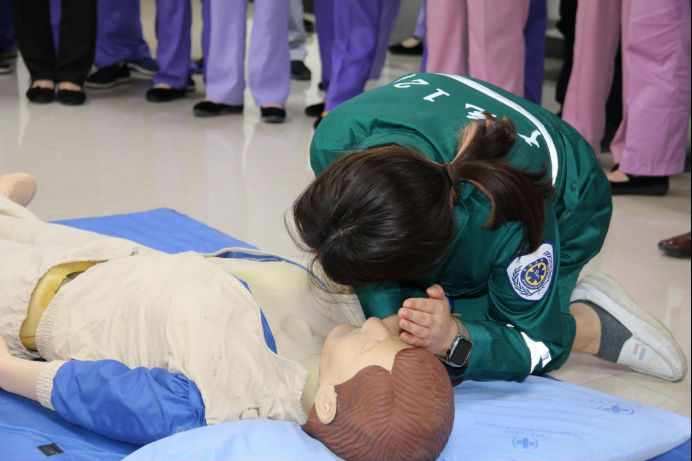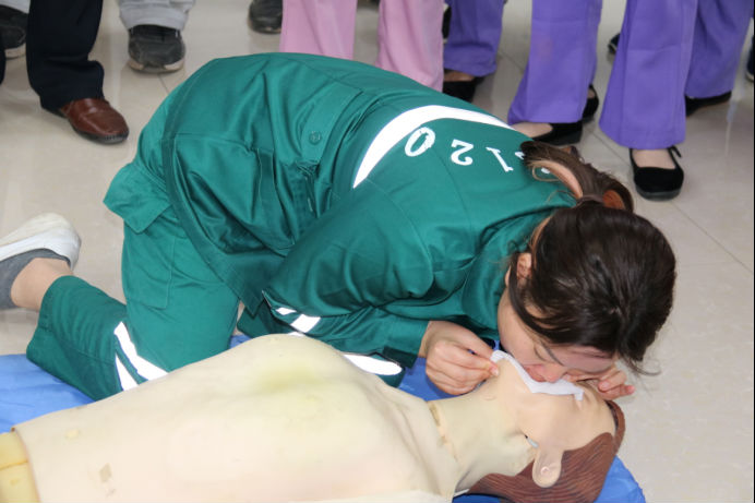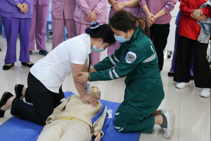 培训中,大家认真学习,并在培训老师的悉心指导下亲自体验抢救过程。