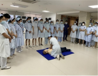 随后,门诊护士张莉演示了徒手心肺复苏术操作流程,并对操作中的要点进行了一一讲解,并手把手指导每位参训人员进行实际操作,对不正确的手法及姿势予以纠正,确保人人掌握心肺复苏术。