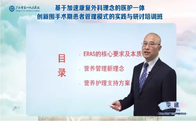 四川大学华西医院李建教授从ERAS的核心要求、营养管理新理念、营养护理支持方案三方面对《ERAS模式下的营养管理探索》进行了交流。