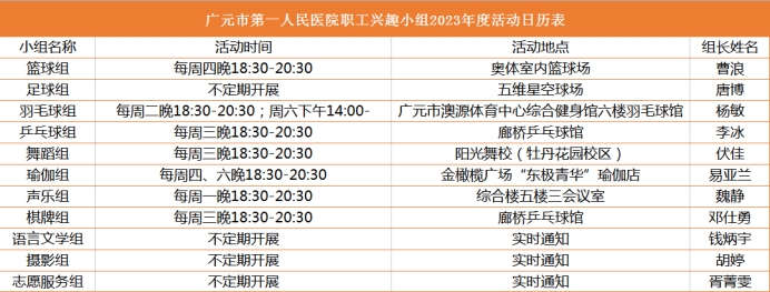 活动内容:兴趣培养、日常训练、友谊赛、院内外比赛、小组活动等