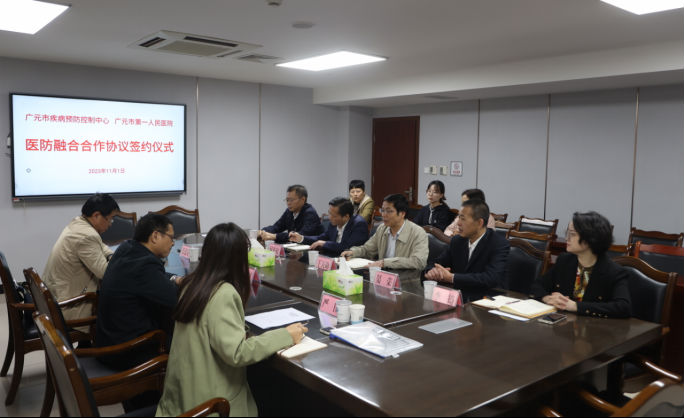为深入贯彻落实党的二十大精神,积极探索“以人民健康为中心”的医防融合机制,加快推进我市公共卫生体系建设,2023年11月1日,广元市第一人民医院与市疾病预防控制中心于综合楼四楼一会议室举行医防融合合作签约仪式。市疾控中心主任杨广树及相关领导;市第一人民医院党委副书记、院长王天勋,党委委员、副院长母存富等在家班子成员及相关科室负责人出席签约仪式。