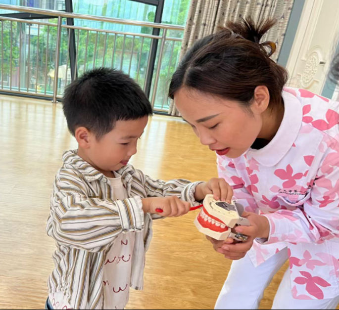 接着,在医护人员的指导下,孩子们手持牙刷,认真专注地学习正确的刷牙方法。