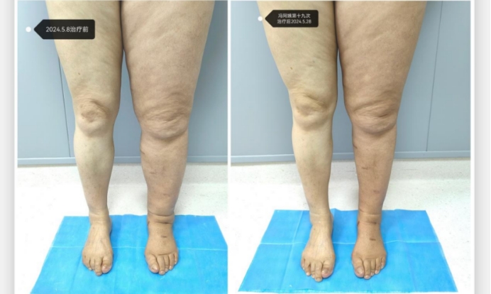 患者,61岁,因宫颈癌术后放化疗后4年,发现左下肢水肿10+月,2023年底行淋巴管和静脉吻合术,消肿效果不佳。2024年5月8日,来院行淋巴水肿治疗,5月29日治疗结束。