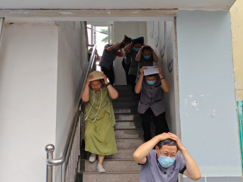 下午5点整,张耀武副院长宣布演练正式开始。随着地震警报启动,参加演练的人员双手护住头部,模拟演练就近避震三分钟,弯腰迅速沿着楼道或贴着墙面跑出,按照既定路线有序撤离。运送保洁工作人员及时疏导、带领病人及家属按照规定的逃生路线安全而有序地撤离。后勤工程部人员对水电气及机房设施故障进行抢救恢复,必要时进行应急发电,保障应急水电气使用。