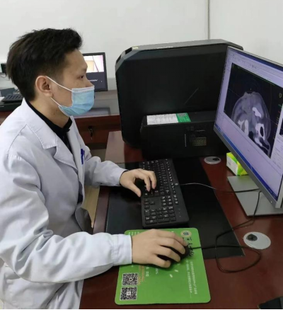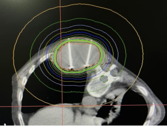 杨金平副主任勾画肿瘤靶区,有效保护周围重要危及器官的同时,给予肿瘤治疗足够的放射处方剂量;物理师徐杨根据剂量要求,按照插植放疗计划,进行插植治疗, 所有流程都在计划当中有序进行。