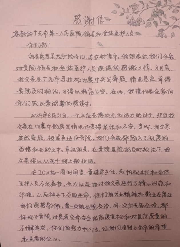 “2024年8月31日,一个本是充满欢乐和活力的日子,却因我父亲在比赛中的突发情况而变得紧张和不安。当时,我父亲突然晕厥,被紧急送往贵院。我们全家都陷入了极度的恐慌和无助之中。幸运的是,在贵院的及时救治下,我父亲得以从死亡线上被拉回。”