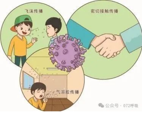 空气飞沫传播:患者咳嗽、打喷嚏时,病毒会随飞沫排出,被周围的人吸入而感染。