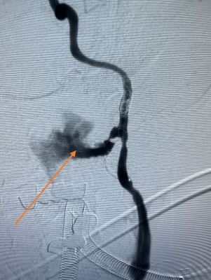 由于内镜下止血困难,考虑鼻咽癌治疗后并发颈内动脉爆裂综合征大出血,治疗团队立即将患者转入复合手术室。此时,神经外科脑血管病团队早已枕戈待旦,无缝衔接开始手术。面对患者大出血的危急情况,神经外科昝春树主治医师来不及穿戴铅衣,一头扎进抢救工作。股动脉穿刺,微导管、超滑导丝导引导管迅速超选至左侧颈内动脉等系列操作一气呵成。术中造影证实了左侧颈内动脉假性动脉瘤破裂出血,像一股洪流一样持续向外喷出。