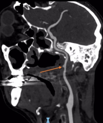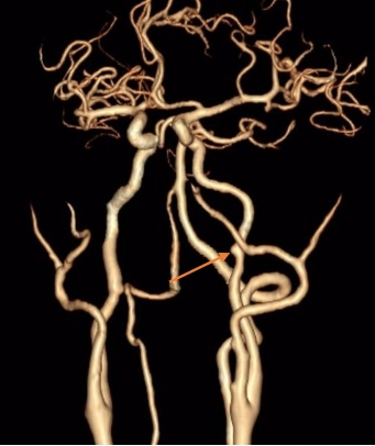 入院后,治疗团队为其完善血管头颈部CTA检查,发现肿瘤包绕颈内动脉,左侧颈内动脉肿瘤包绕处可见假性动脉瘤,基底动脉环显示左侧后交通动脉粗大。