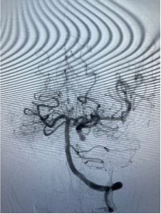 “患者左侧颈内动脉后交通动脉粗大,假性动脉近远端已经发生夹层改变。”手术团队凭借丰富的经验,果断决策闭塞左侧颈内动脉,选择大而长的弹簧圈在假性动脉瘤近远端闭塞颈内动脉,成功止住出血。取出咽喉部压迫棉片及棉条均无活动性出血,继续输血、输血浆,予以抗休克治疗。全脑血管造影显示,后交通动脉代偿良好,左侧大脑中动脉血流速度正常,眼动脉显影良好,患者的生命体征逐步恢复正常。见患者情况逐渐平稳,所有人都松了一口气。