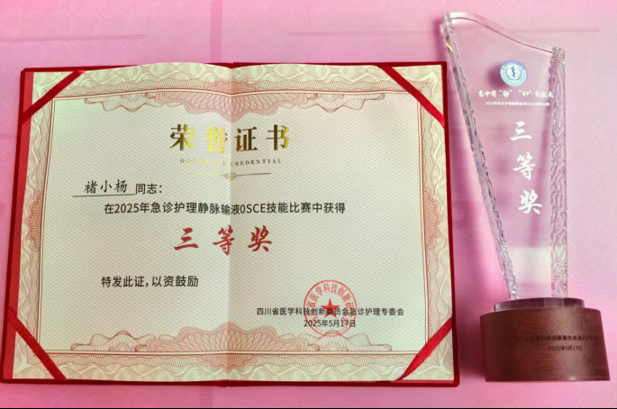 近日,在“四川省2025年急诊护理静脉输液OSCE技能大赛”中,市第一人民医院急诊科褚小杨护师凭借过硬的专业技能和出色的临场发挥,从全省近百名选手中脱颖而出,荣获大赛三等奖,展现了医院护理团队的精湛技艺和职业风采。