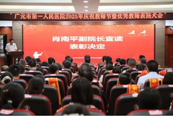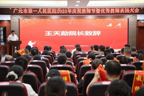 为庆祝全国第41个教师节,2025年9月10日,广元市第一人民医院在学术报告厅召开教师节庆祝大会,对过去一年来在教学工作中涌现出的先进集体和个人进行表扬,旨在展现医院立德树人、自信自强的精神风貌,弘扬教育家精神,营造尊师重教的良好氛围,激励全院职工奋发向上、再接再厉,进一步推动教学再上新台阶。医院领导班子,相关职能部门负责人,规培基地管理者、全体老师和住培学员代表参加本次大会。