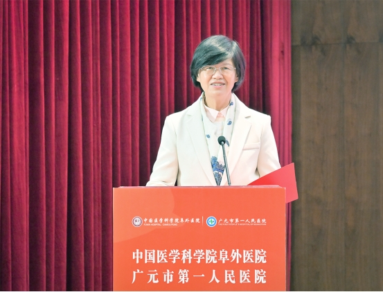 揭牌仪式上,中国医学科学院阜外医院副院长杨伟宪对“中国医学科学院阜外医院 广元市第一人民医院心血管病技术培训中心”的成立表示热烈的祝贺。她表示,阜外医院作为心血管“国家队”以及国家卫生健康委、国家发展改革委批复的首个国家医学中心,始终致力于顶天立地的事业。一方面,以阜外的品质与创新持续引领我国心血管医学高质量发展;另一方面,胸怀家国情怀,重视人才培养与技术普及,推动优质医疗资源扩容下沉。她讲到,近年来,广元在市委、市政府的坚强领导下,全力以赴拼经济,以发展惠民生,市卫健委高度重视健康广元建设,持续优化资源配置,打造“医在广元”的品牌,此次携手合作将有助于进一步推动心血管病的防治能力的新理念、新技术在广元市的落地生根。未来,双方将以心血管病技术培训中心的成立为契机,通过多层次、多维度的学术交流、科研合作、手术指导、进修培训、阜外日坐诊等形式,共同促进广元市乃至川北地区心血管病防治事业的发展,为川北群众增添新的健康福祉。