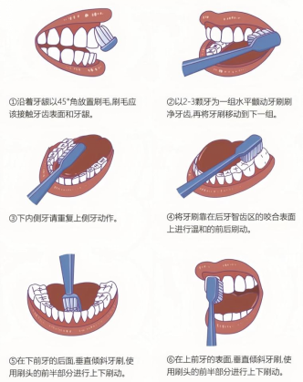用小头软毛牙刷+含氟牙膏,采用“巴氏刷牙法”(轻柔清洁牙齿和牙龈交界处),饭后15分钟内、睡前必须刷牙;