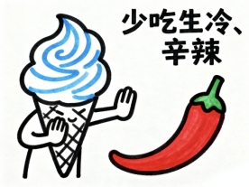少吃生冷、辛辣、油炸等刺激性食物,进食定时定量、细嚼慢咽;明确有食物不耐受的人群,需刻意避免相关食物(如乳糖不耐受者少喝牛奶),减少肠道刺激。