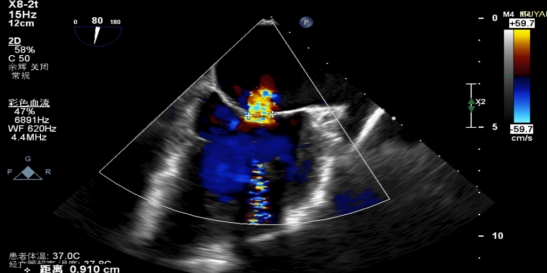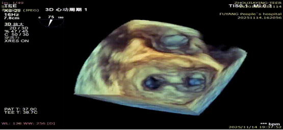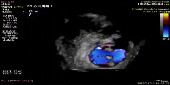 手术当日,在全身麻醉及TEE全程导航下,陈玺全副主任团队凭借丰富的临床经验与精湛操作技巧,顺利完成房间隔穿刺、瓣叶精准定位等关键步骤。针对患者二尖瓣A2/P2 区域反流靶点,团队精准夹合瓣叶,经X-plane技术与三维超声反复确认夹持质量后,成功释放一枚MitraClip XTR夹子。术后即时评估显示,患者二尖瓣反流由术前3 +重度降至轻度,平均跨瓣压仅3mmHg,手术达到预期效果,全程无并发症发生。